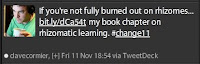 As Dave Cormier posted a tweet about his book and the chapter Community as Curriculum – vol 2. The Guild/Distributed Continuum covering a rhizomatic viewpoint on education and I retweeted it, he asked me to post some material about swedes working in education who is interested in Deleuze and Rhizome. Here goes:
